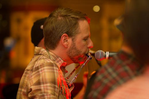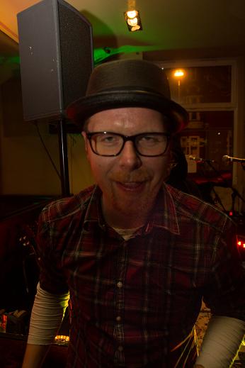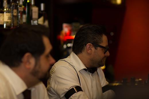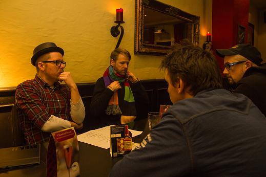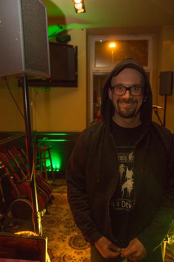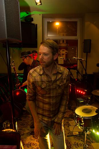 Während des Auftritts. Die Band beißt sich durch. Veranstalter Mike weidet sich von der Theke aus an den Qualen der Kapelle. (Was man nicht sieht: Unter ihm stapeln sich Berge von Noten, Textblättern und ein Teleprompter…)