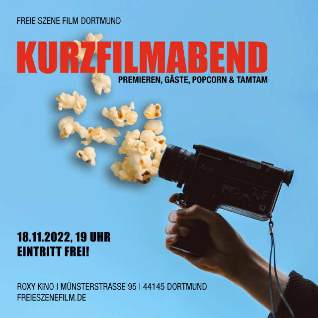 Am Freitag, den 18.11.2022 um 19 Uhr versammelt sich die lokale Kurzfilmszene und feiert Kurzfilm-Premieren mit vielen Gästen, Popcorn & Tamtam im Roxy Kino, Münsterstraße 95, 44145 Dortmund! Die Freie Szene Film Dortmund bringt das unabhängige Filmschaffen der Stadt auf die große Kino-Leinwand. Danach: Drinks & Sound im Foyer. Eintritt frei!